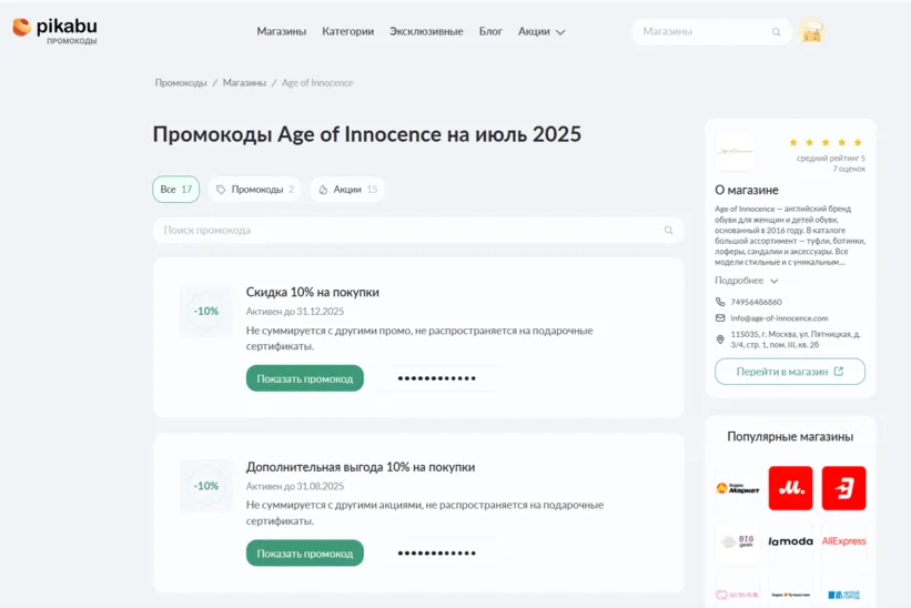 Промокоды, купоны и скидки на покупки в Age of Innocence вы можете найти у нас на сайте. Мы регулярно обновляем список предложений и следим за их актуальностью. Обратите внимание: большинство кодов действуют ограниченное время, поэтому рекомендуем использовать их сразу, как только нашли подходящий вариант. Некоторые купоны подходят только для определённых категорий товаров или при заказе от установленной суммы.