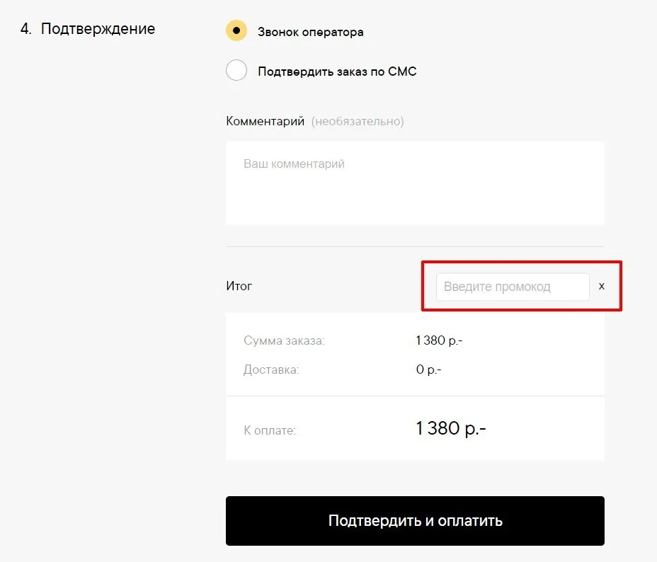 Введите код и подтвердите его. Скидка автоматически будет применена к итоговой стоимости покупки.
