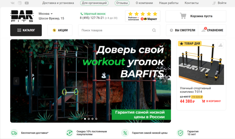 Barfits — российская компания, которая производит и продаёт спортивное оборудование с 2014 года. В интернет‑магазине представлен большой ассортимент спортивных товаров: турники, шведские стенки, уличные спортивные комплексы, груши и аксессуары для фитнеса и тяжёлой атлетики. Всё изготовлено на своих площадках и соответствует ГОСТ, проходя прочностные испытания. На сайте Barfits удобно смотреть товары, читать характеристики, оформлять заказ с доставкой по России и бесплатной установкой в Москве и Санкт‑Петербурге.