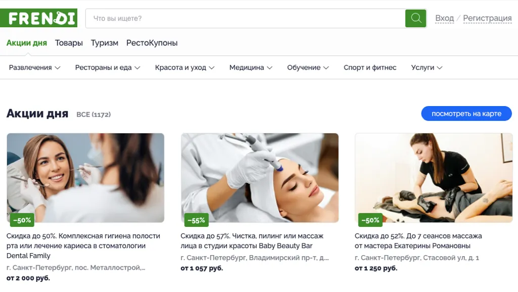 Френди — это популярный онлайн-сервис, предоставляющий доступ к широкому спектру услуг и развлечений с возможностью приобретения по выгодным ценам. Сервис специализируется на предложении скидок и акций в различных сферах жизни, от ресторанного бизнеса и красоты до обучения и медицинских услуг, обеспечивая пользователей экономичными и качественными решениями.