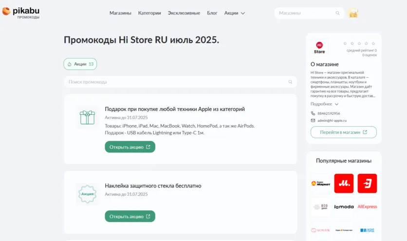 Актуальные промокоды и купоны Hi Store можно найти не только у нас, но и на официальном сайте магазина. Обычно промокоды и скидки публикуются в разделе с акциями или всплывают на баннерах — особенно во время распродаж. Также скидки могут приходить в e-mail-рассылке или появляться в Telegram-канале магазина. У промокодов всегда есть срок действия, и лучше использовать вовремя — иначе выгода просто «сгорит».