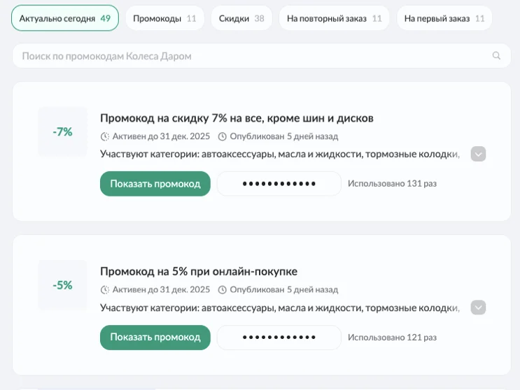 Дисконт до 50% на авто‑ и мотошины, диски, АКБ, масла и аксессуары