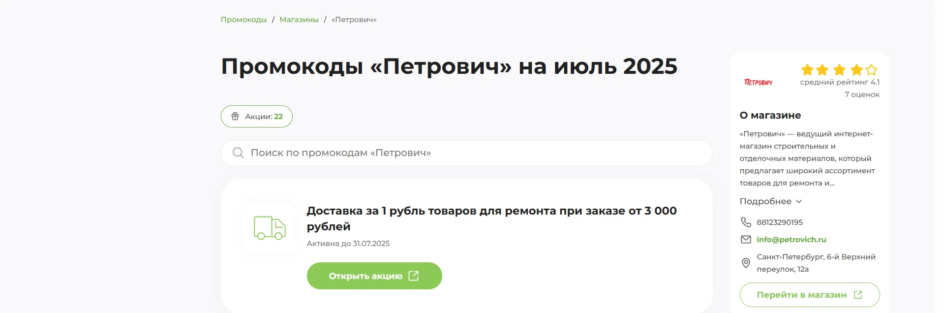 «Петрович» — один из крупнейших интернет-магазинов строительных и отделочных материалов в России, работающий как для частных клиентов, так и для профессиональных строителей. Компания начала свою деятельность в 1995 году и сегодня «Петрович» — это не только розничные магазины и склады, но и современный онлайн-сервис, позволяющий делать покупки быстро и удобно из любой точки России. Используя купон или промокод Петрович, вы можете получить выгодную скидку на строительные материалы и оформить быструю бесплатную доставку на ваш адрес, что делает ремонт и покупки максимально удобными и экономичными