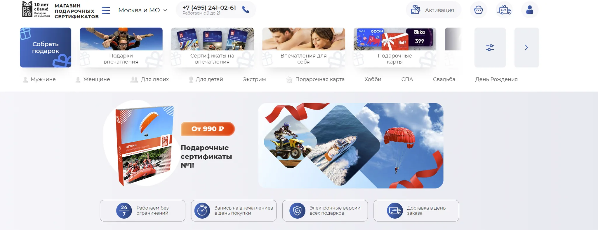 Интернет-магазин ПС Бокс специализируется на продаже подарочных сертификатов и впечатлений, предлагая оригинальные решения для любых праздников. Платформа предоставляет подарки, которые создают незабываемые эмоции и впечатления, делая каждый подарок особенным и значимым. В ПС Бокс вы найдёте множество дивительных подарков как на день рождения, так и на другие праздники.