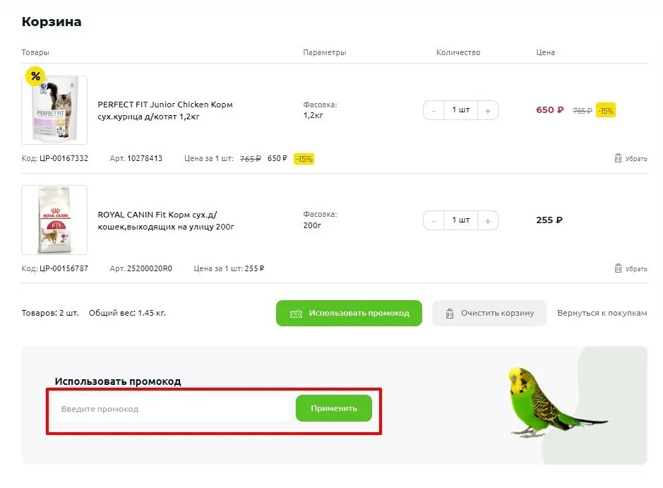 На странице корзины найдите поле для купона.