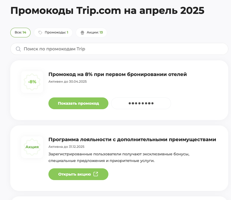 Основная информация о купонах и акциях для Трип
